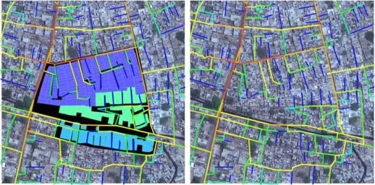 Analysis of the spatial structure helps to identify how the spatial device of the Gali works in this context. The settlement can be seen as a set of discrete neighbourhoods where the residential areas are spatially segregated from the wider movement patterns of the city. This means that while residents may live in close physical proximity, perhaps even in buildings which share a party wall, the structure of the settlement means they rarely come in to contact with each other unless on the neutral territory of the commercial edges (Figure 4). This pattern is repeated across the other study area settlements.