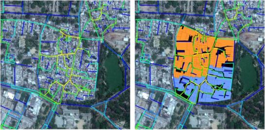 Within the same study area, a further characteristic can be seen: each of the Caste group’s Galis focus on a particular edge which strengthens it and gives each group a localised centre. The Brahmins’ centre is the strongest at a local radius, followed by the working class, and finally the Untouchables – where the strongest shared space is the edge of the Nala. The variation of activities that take place on each of these centres reflects the socio-economic circumstances of each group with a concentration of shops along the Brahmins’ centre, craft shops and workshops along the working class’ centre, and no economic activity but only public facilities in the Untouchables’ centre.