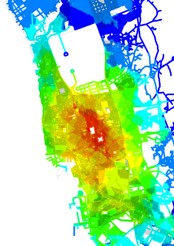 This approach has also allowed us to find a way to work around some of the characteristics Space Syntax modelling sometimes struggles with. In particular extreme morphologies – these don’t tend to be such an issue in more developed cities, but in places which have grown rapidly and we’re looking at them during a transitionary phase, there can be unusual characteristics.
