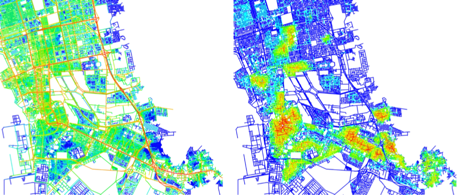 These techniques can be used to compare different cities around the world, as well as to look at the hierarchies of space in individual cities. One of the consistent key findings is that cities that perform well have spatial networks where the same spaces are well connected at multiple scales. This means that the spaces that people use without thinking about, are the same for short, local journies as they are on a wider journies across the entire city. Consequently, some spaces bring together different people in the same space at the same time, creating opportunities for chance interaction – people can come into contact with people they don’t already know, or haven’t arranged in advance to meet. In turn this creates opportunities for economic and social activities. In cities designed in the latter part of the twentieth century, which often prioritised the car, it can be seen that their spatial networks do not have this multi-scale characteritstic. Typically in these cities, at the wider scale a different set of spaces are strongest and tend to be used by more traffic, while a set of isolated local areas are fragmented from the wider city.